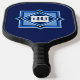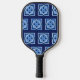This pickle ball paddle has a contemporary geometric design, in shades of blue. The front design is made up, of blue squares that overlap each other. In the centre there is an area for a monogram. On the back of the paddle there is a repeating patter of the design on the front.