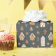 Whimsical Christmas theme wrapping paper featuring illustration of gingerbread houses with blue accent.