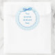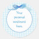 Round sticker with an image of baby blue gingham and a white circle with a blue border, pretty blue blow and customisable text. A wonderful special touch for your baby shower invitations or gift. See matching favour box, favour tag and label. See the entire Kids’ Corner Sticker collection in the INVITES | Stickers & Labels section.