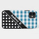 Modern meets country inspired iPhone 5 Case designed with a blue & white gingham pattern on top, a black & white polka dot pattern on the bottom, and personalised with your name or custom text in white over a diagonal black stripe.