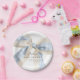 A cute baby shower paper plate for a baby boy or gender neutral baby shower, this design has a large pastel blue gingham checks bow tilted to one side. A simple text template allows you to personalize this plate with the guest of honor's name and the shower date. Plates are available in 2 sizes: shown here in the smaller 7-inch diameter size, they are also available in a larger 9-inch diameter size.
