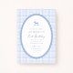 Classic and timeless blue gingham first birthday invitation featuring a sweet rocking horse illustration inside a soft scalloped frame. This elegant storybook baby boy birthday invitation is perfect for celebrating a little one’s first birthday with a traditional, vintage-inspired style. The soft blue palette and delicate typography make it ideal for a boy first birthday party, nursery rhyme themes, heirloom-style celebrations, and classic childhood events. A charming choice for parents looking for a refined blue rocking horse birthday invitation with a gentle, traditional feel.
