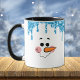 This mug has a happy snowman face on two sides. The top is bordered with sparkly blue glitter drips. Your name or other text is located between the snowman faces. Cute for Christmas and all through the winter.