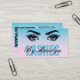 Make a bold statement with this glitter gradient "Lashes" business card design, perfect for lash technicians, beauty salons, or anyone in the cosmetics industry. The shimmering backdrop transitions from cool blue to soft pink, evoking a sense of elegance and modernity. The striking black graphic of eyes with luscious lashes draws immediate attention, while the large text "LASHES" ensures your message stands out.