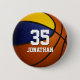 This custom team colours basketball button for boys or girls features the realistic image of a basketball that has two recolored panels--one blue and one gold - personalise with the athlete's name and jersey number in a varsity letter style font - by katz_d_zynes