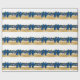 A beautiful and elegant repeating pattern of golden stripes and a tree garland / wreath decoration filled with blue berries, green leaves and a FAUX cobalt satin bow with a silver buckle.