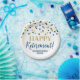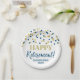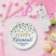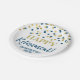 Custom happy retirement plates in dark navy blue and gold confetti pattern.