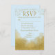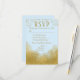 An elegant blue and gold RSVP card featuring gold dust confetti at the top and gold accent, along with meal options.