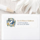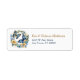 This return address label has a beautiful image of blue butterflies flitting around a wreath of gold and blue flowers. Your name and address are at the right of the image in matching gold and blue.