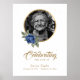 Elegant blue and gold funeral photo welcome sign featuring a gold photo frame adorned with blue roses.