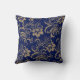 This image features a pretty antique gold floral swirl pattern over a deep blue background. Both sides of the pillow have the same image. Elegant, with a bit of an art nouveau style.