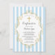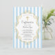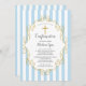 Confirmation invitation featuring a blue & white stripe background with a gold cross & frame for a boys confirmation.