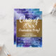 Blue and purple watercolor and gold glitter graduation party invitation.