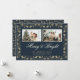 Elegant custom blue and gold photo Merry Christmas card featuring gold holly on a dark blue background. Easily personalise this photo Merry and Bright holiday card with your favourite photos and the family name.