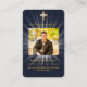 A dark blue background, a faux gold frame and space for your photo. A golden cross. Light beams, behind the photo. Personalise and add name, dates and your text and prayer.
