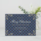 Elegant personalised blue and gold Merry Christmas cards featuring holly on a black and blue buffalo plaid background. Easily personalise these blue non-photo Christmas cards with your family details.