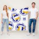 This fun volleyball themed fleece blanket features 5 randomly arranged blue, gold and white volleyballs with the text, "The volleyball court is my happy place" in blue encircling each volleyball in a cool typographic font, all on a white background - her name and jersey number are customizable - by katz_d_zynes