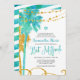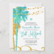 Modern blue and green watercolor with faux gold glitter tropical Bat Mitzvah invitations. Design features palm trees, string lights and swirls. Designs are flat printed illustrations/graphics - NOT ACTUAL GOLD GLITTER.