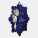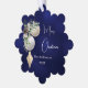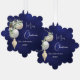 A navy blue, uneven coloured background. Decorated with white and gold baubles and some greenery and a pine cone. Personalise and add your name, year. Text: Merry Christmas