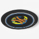 Black rims circle the plate with a Black background and a modern art basketball graphic/logo. Nine inches in size and made of paper. Customise or buy as is.