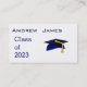Blue graduation cap 2023- name card .Premium Pearl paper type and dark blue fonts .Personalize both sides now .- printed on premium card.Great keepsakes for your friends and family .Send them out to inform them about your graduation /changed status in the society .