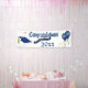Class of graduation congratulations banner done in blue, white, and gold. Graphics of blue balloons, golden stars, a mortarboard cap and a blue class of banner decorate the white indoor banner. Blue graphic text reads Congratulations. Personalise the blue year to suit your graduation event needs.