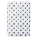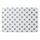 Blue-gray cross stitches on white bath mat