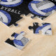 This volleyball pattern jigsaw puzzle for girls features a larger blue, gray and white artsy, stylized volleyball, upon which her name and jersey number can be personalized, overlying a pattern of smaller blue, gray and white volleyballs on a black background and "I love volleyball" varsity-letter-style text in gray stretching between the angled rows of volleyballs - by katz_d_zynes