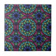 The mandala is divided into multiple layers, each featuring a different geometric pattern, including squares, triangles, and circles. The colours used in the design range from deep, vibrant blues and greens to lighter shades of purple and violet, which creates a sense of depth and movement within the design.