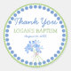 Sweet baptism sticker design. A double row of blue and green dots edges this cute sticker. A small bouquet of blue wildflowers is at the bottom. The text says thank you, then the child's name and baptism and the date of the baptism. It is in the same green and blue as the dots. Easy to customise.