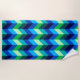 A beach towel featuring a colourful, ombre pattern design of chevrons in lime green, royal turquoise, ocean blue and sky blue.