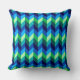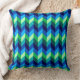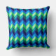 A 20” x 20” throw pillow featuring a colourful, ombre pattern design of chevrons in lime green, royal turquoise, ocean blue and sky blue.