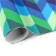 A roll of wrapping paper featuring a colourful, ombre pattern design of chevrons in lime green, royal turquoise, ocean blue and sky blue.