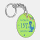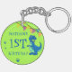 Blue Green Paw Dinosaur Theme Birthday Party Favour Keychain . The design has blue smiling cute dinosaur with paw prints and FIRST BIRTHDAY written in cute fun font on a green background . These cute birthday party favour keychains can be easily customised by changing the name of the birthday boy/girl . For any further customisation , feel free to contact me at mypaperlove2021@gmail.com