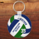 This volleyball keychain with team name features the image of a volleyball that has blue, green and white panels, upon which you can customise the player's name and jersey number plus school team and mascot name - by katz_d_zynes