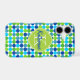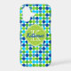 © 2014 Socialite Designs. Make a fashion statement with this blue and green polka-dot pattern and banner, for your name and monogram, mobile phone case.