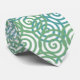 This necktie has a Boho design of overlapping spirals in blue and green on a field of white.