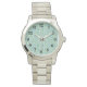 This women's watch has a Boho design of overlapping spirals in blue and green on a field of white.