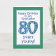 A stylish 80th Birthday Card for a Stepfather, with the number 80 made from a handpainted paper collage, in blue, green and white, coordinating with the lettering and the card's border. Don't forget you can easily customise the inside of this 80th Birthday Card.