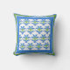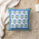A throw pillow or cushion, with an Art Nouveau pattern in bright blue, white and green, from a handpainted design by Judy Adamson.