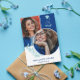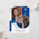 Double sided graduation invitation in white and blue with overlapping photos and greenery with clean fonts. Photo graduation invitation with a modern design personalised with photos of the graduate, two on one side and one on the other, and the graduate's name, the year, and school. Blue greenery graduation invitation with photos and a unique layout in blue, white, and turquoise.