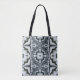 An intricate blue-grey geometric pattern decorates this tote bag.