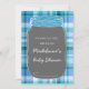 Personalised baby shower invitations in elegant and modern bright blue, teal, grey and white country plaid pattern with a cute mason jar illustration. Customisable with your text, contact us to request a colour change.