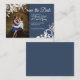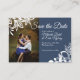 White floral pattern frames your photo on this blue grey save the date card. Simple wedding design is versatile for anniversaries and birthdays, and is beautiful way to announce your wedding date. Decorative photo border design can be transferred to other products. Unique artwork beautifully lays over your engagement photo.