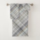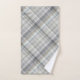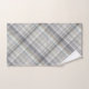 A colourful repeating plaid pattern of diagonal stripes in shades of blue, grey, and tan.