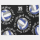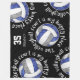 This fun volleyball themed fleece blanket features 5 randomly arranged blue, grey and white volleyballs with the text, "The volleyball court is my happy place" in white encircling each volleyball in a casual handwritten font, all on a black background - the volleyballs' blue & grey panels are blended with an artsy, girly floral pattern for a textured appearance - her name and jersey number are customisable - by katz_d_zynes
