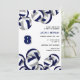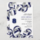 This volleyball themed party invitation for a birthday or team party features clusters of navy blue, grey and white volleyballs at the top and bottom edges on the front and a single cluster covering the back of the invitation - customise the party details on a white background - by katz_d_zynes
