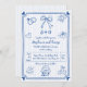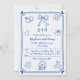 Blue hand drawn scribble whimsical wedding Invitation with QR code. Celebrate your special day with this unique and whimsical wedding invitation. Hand-drawn blue illustrations, including hearts, a ring, and a bow, are playfully arranged on a pale blue and white striped background. The handwritten font and heart-accented frame add a touch of delightful charm. For ease of response, a QR code is included on the back for online RSVP. This invitation is a perfect expression of the joy you will share with your guests.
