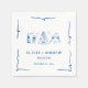 Our hand-drawn napkins, features a three-tiered wedding cake adorned with flowers and hearts, two wine glasses clinking, a bottle of wine with a heart on the label, fireworks, musical notes. The style is simple with a slightly whimsical feel.