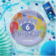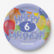 These fun and colourful birthday party paper plates feature the message, "Happy Birthday" spelled out in whimsically arranged realistic blue frosted cutout cookies surrounded by multicolor balloons and bunting flags - child's age and name can be personalised - by katz_d_zynes